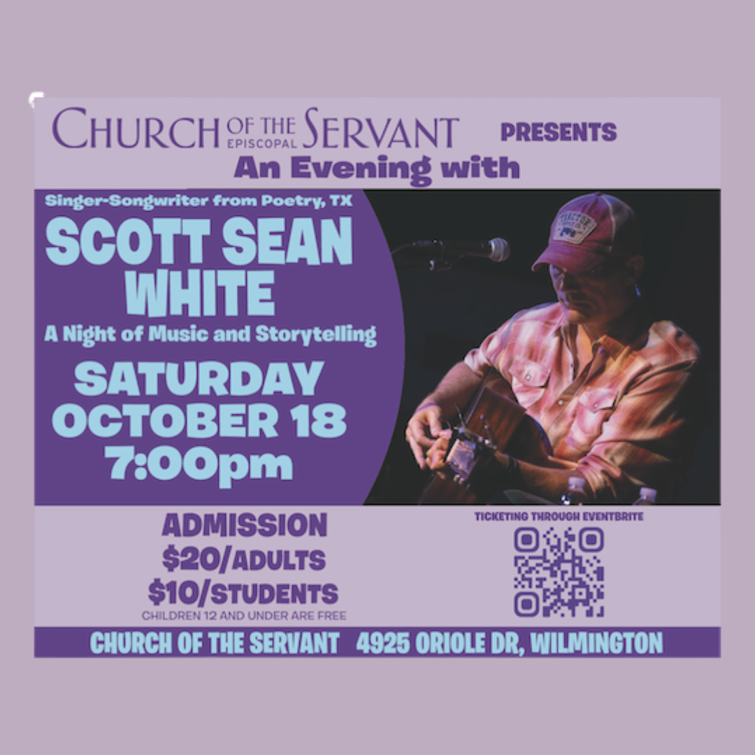 Folk singer Scott Sean White will be in Wilmington for 1 night, at Church of the Servant, Episcopal, Saturday evening, October 18, 7:00 – 8:45. Scott’s heartland rock musical style is reminiscent of Tom Petty, with influence by The Byrds and the Rolling Stones, a combination of soft, poignant country folk, Gospel, and blues.