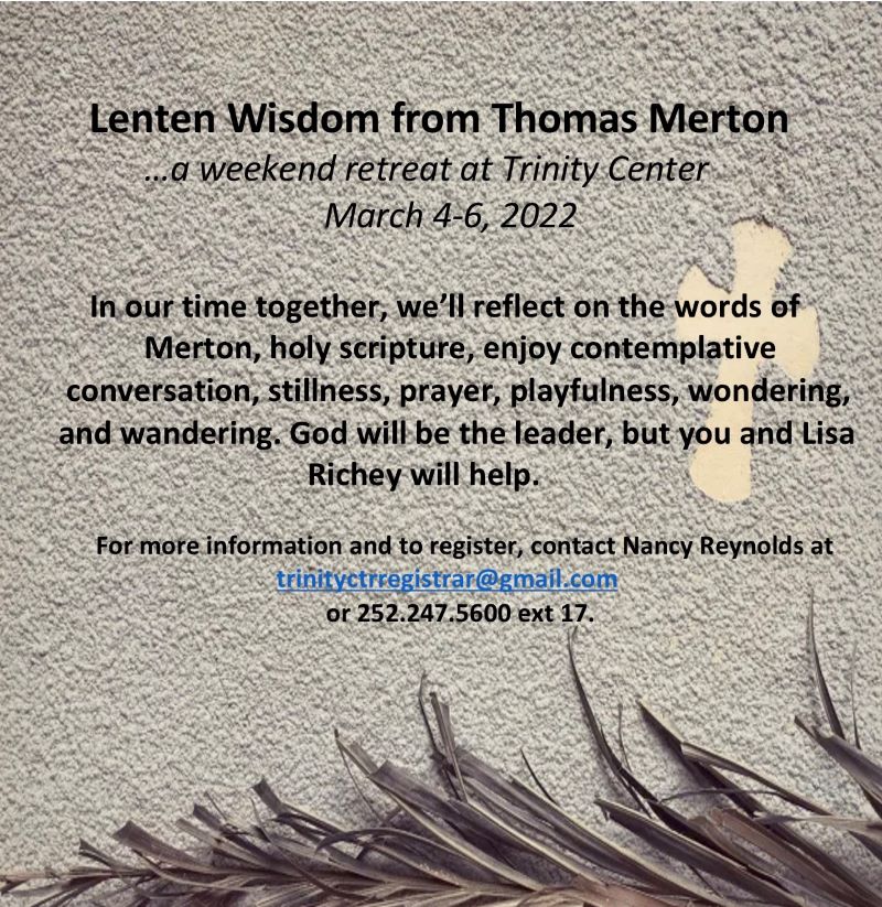 Lisa Richey has been leading prayerful, contemplative Advent retreats at Trinity Center for years. What a treat to have Lisa back, but this time during Lent. Please contact Nancy Reynolds at trinityctrregistrar@gmail.com to make further inquiries.