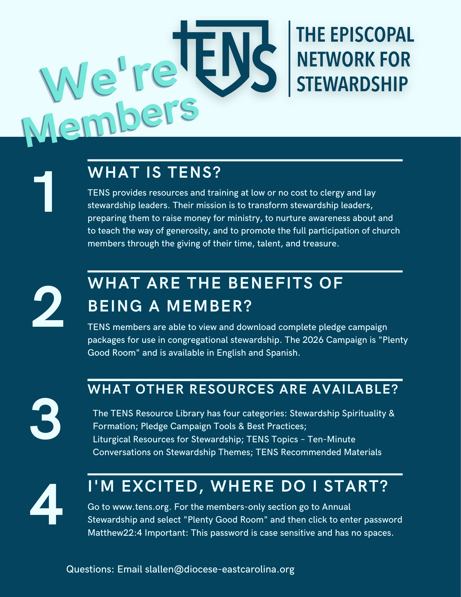 - TENS Information– this flyer explains the benefits of free membership with TENS (The Episcopal Network for Stewardship) for churches, such as complete stewardship campaign packages and other helpful resources you can access