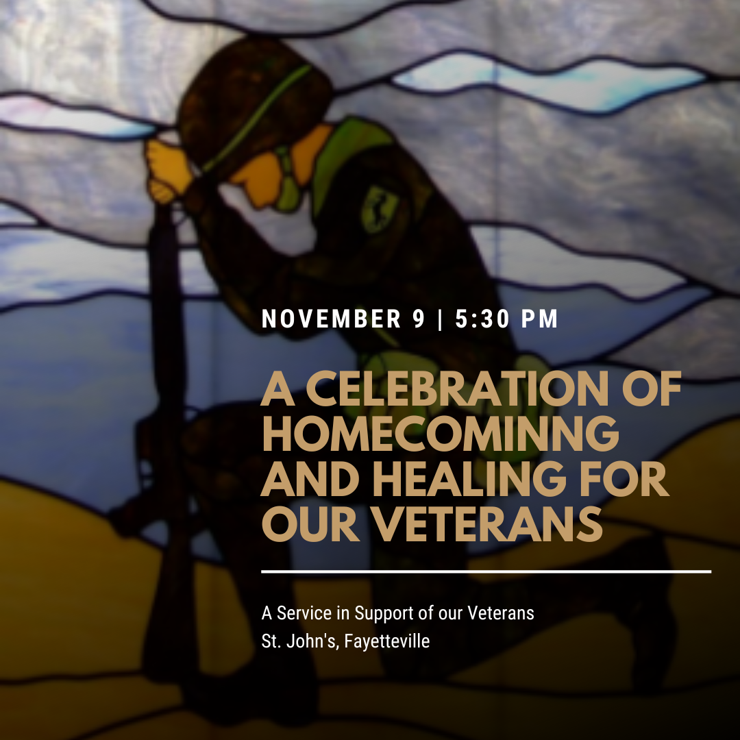 The Episcopal churches of Fayetteville and the Upper Cape Fear Deanery together with the Episcopalians at Fort Bragg will gather for a service of support for our Veterans on Wednesday, Nov. 9th at 5:30 PM at St. John’s Episcopal Church, 302 Green Street, Fayetteville, NC.