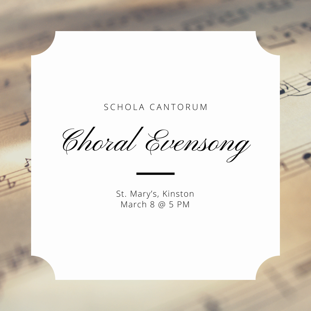 All are welcome to attend Choral Evensong at St. Mary’s, Kinston on March 8, 2026 at 5:00pm with Schola Cantorum.