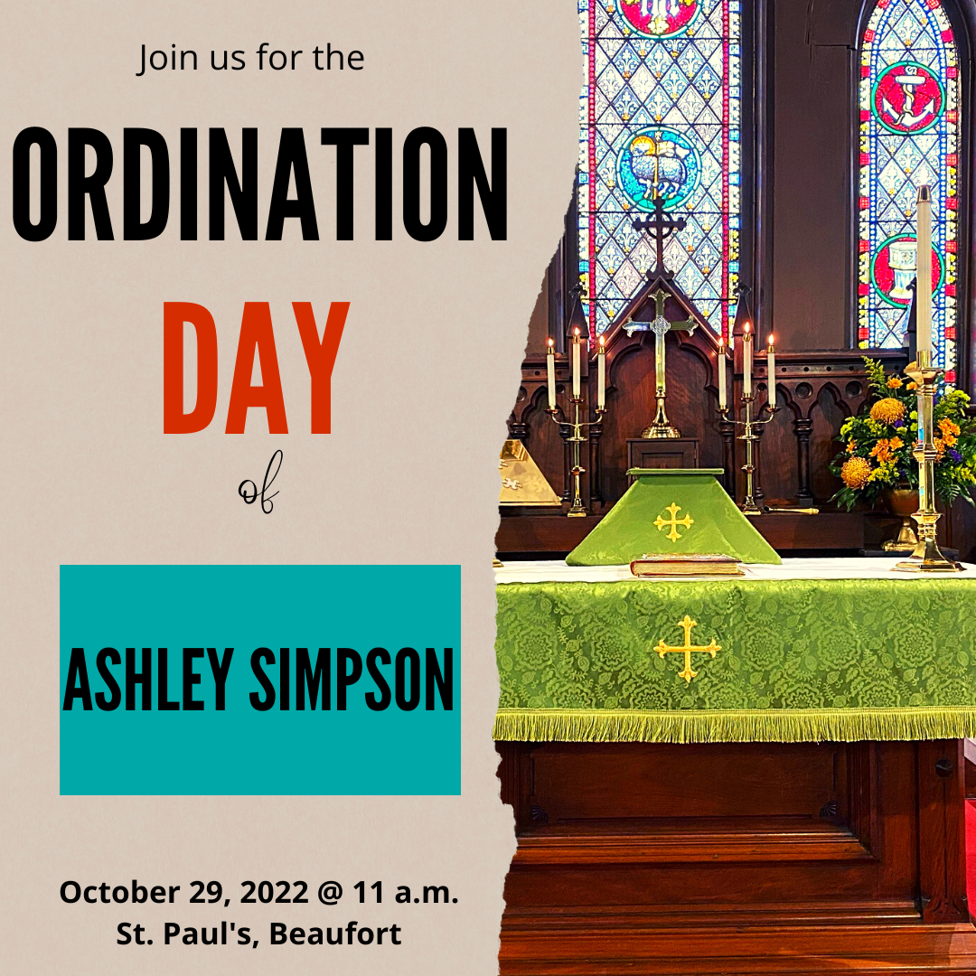By the grace of God and with the consent of the people, the Right Reverend Rob Skirving, Bishop of the Diocese of East Carolina, will ordain Ashley Danielle Simpson to the Sacred Order of Priests in Christ’s One Holy Catholic and Apostolic Church on Saturday, October 29th at 11 a.m. at St. Paul’s, Beaufort. A reception will follow. Your prayers and presence are requested.